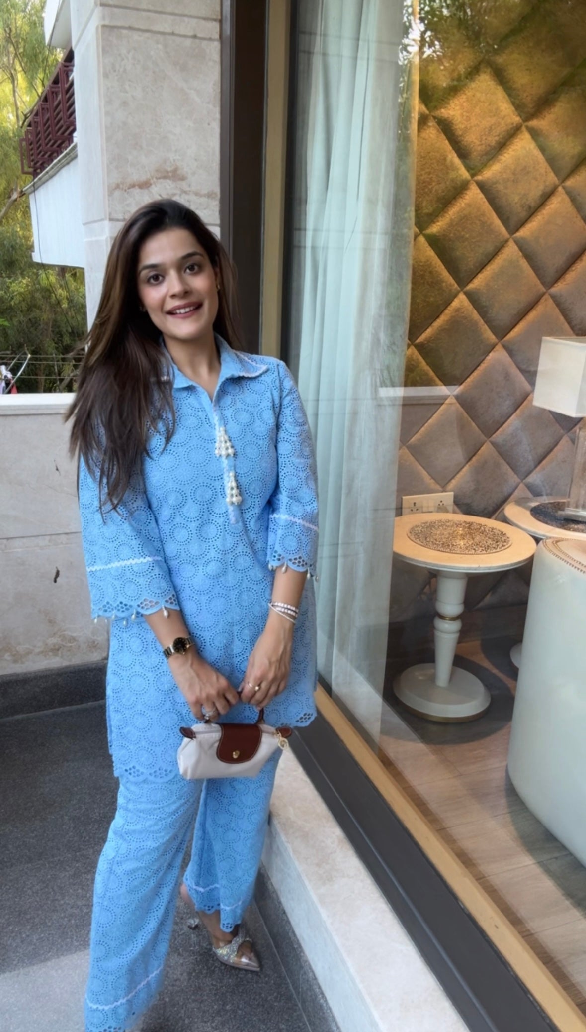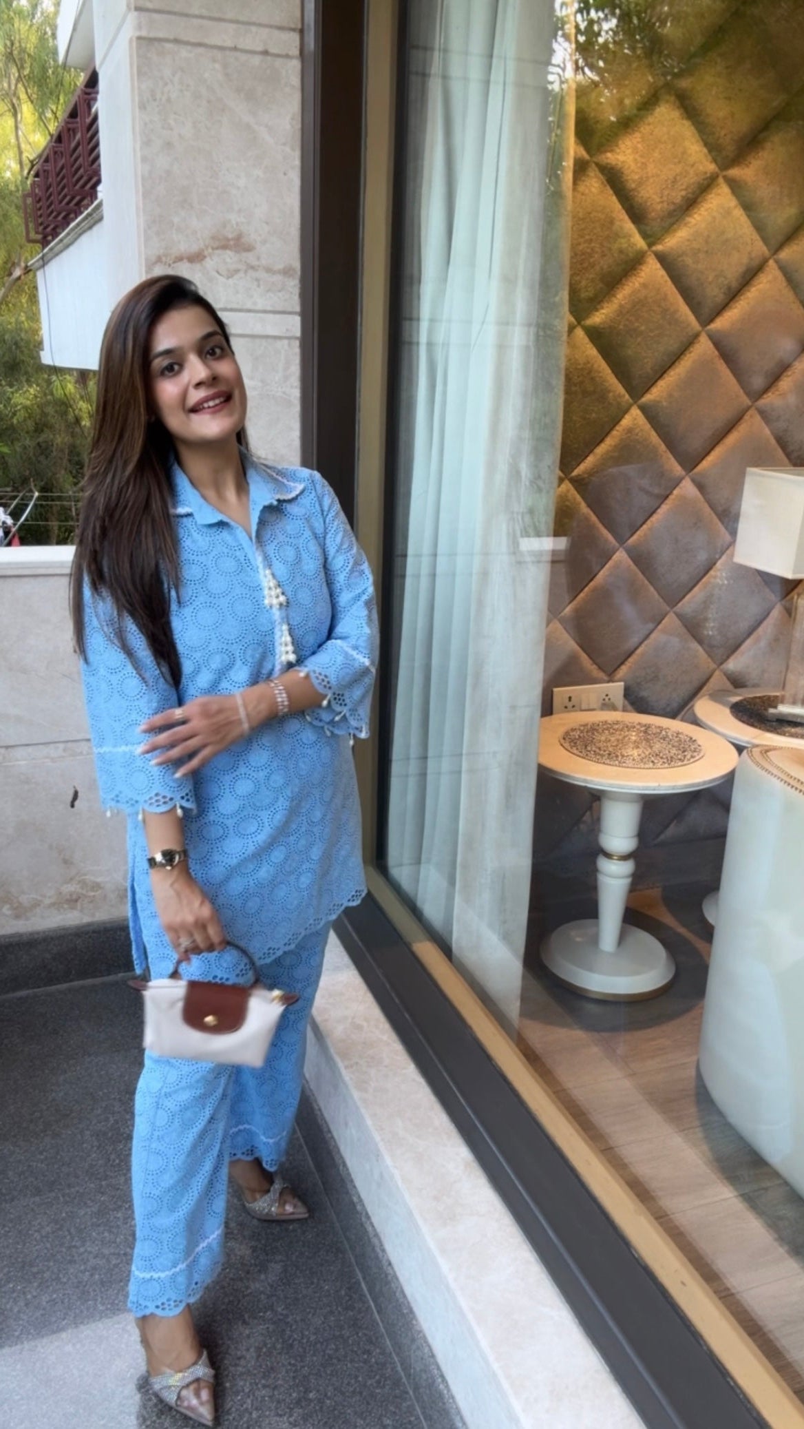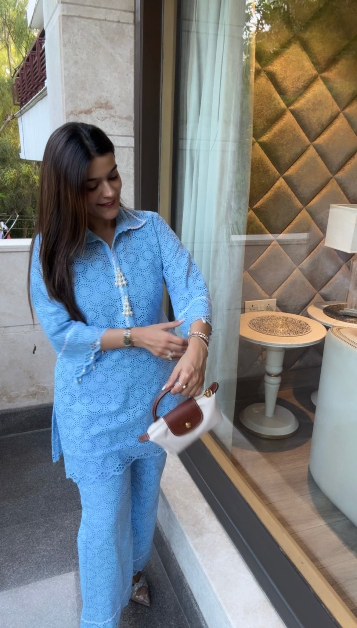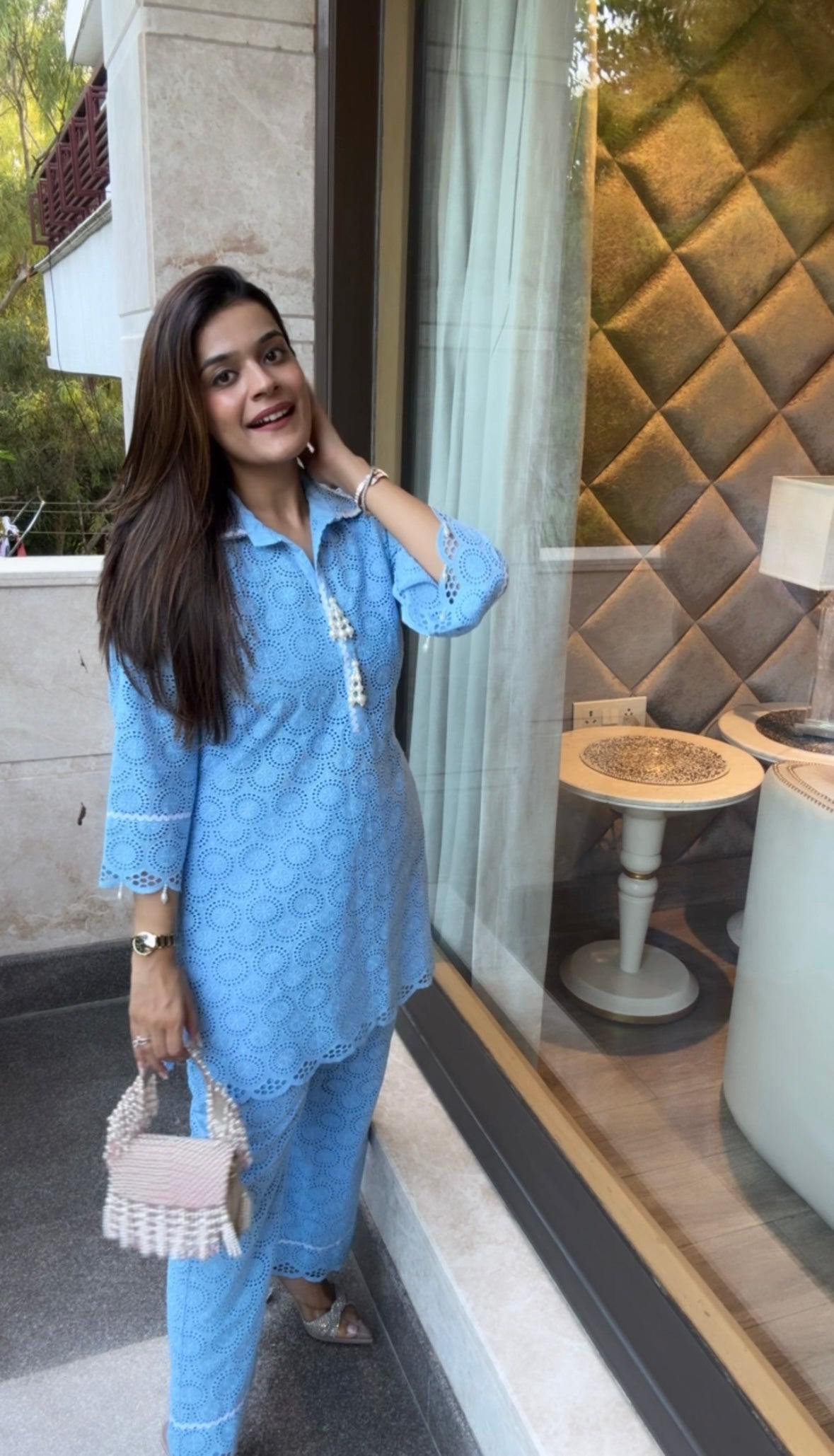 Elevate your wardrobe with the Celeste Lace Set, featuring a periwinkle cutwork kurta paired with matching pants. Delicate pearl tassels add a refined touch, blending intricate craftsmanship with understated elegance. Perfect for occasions where sophistication meets comfort.