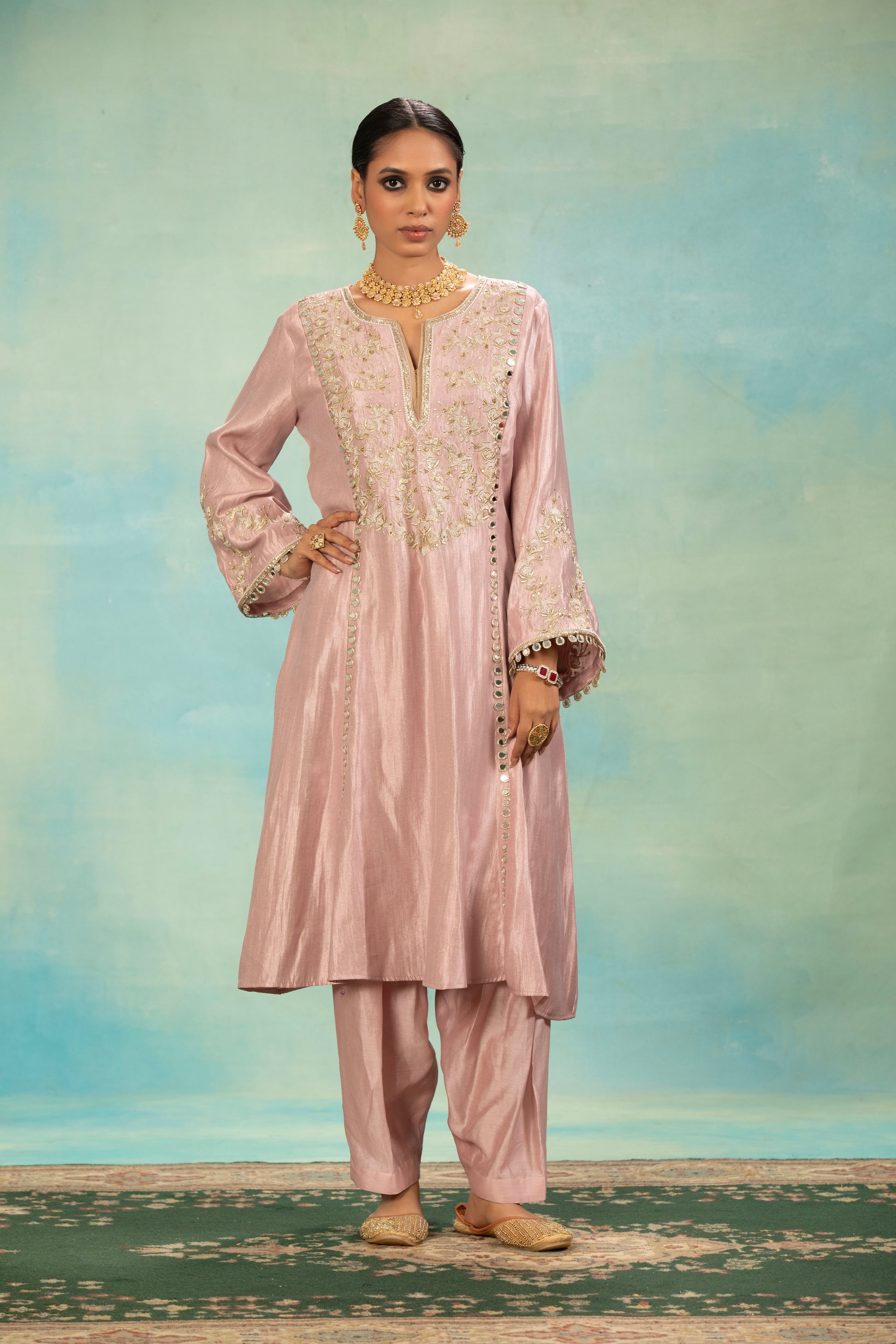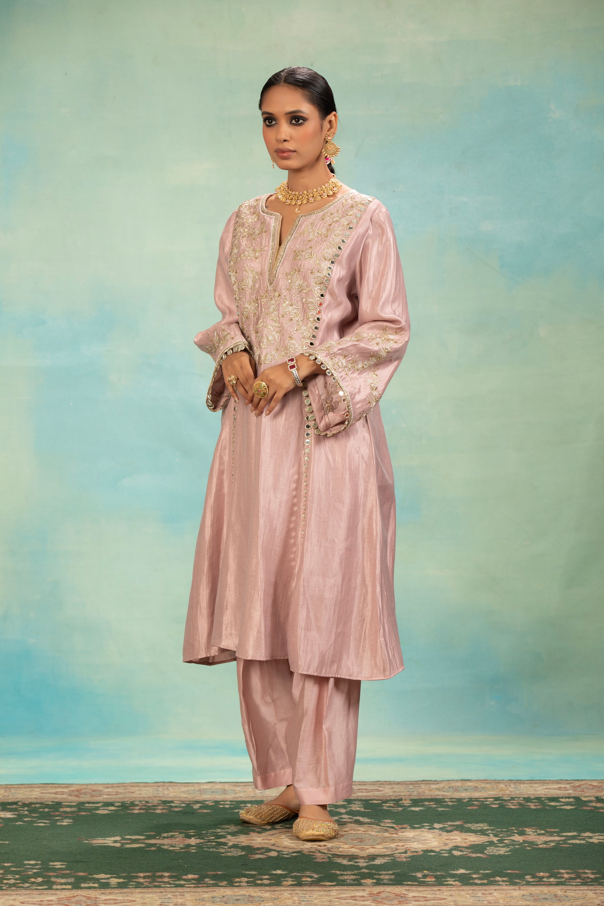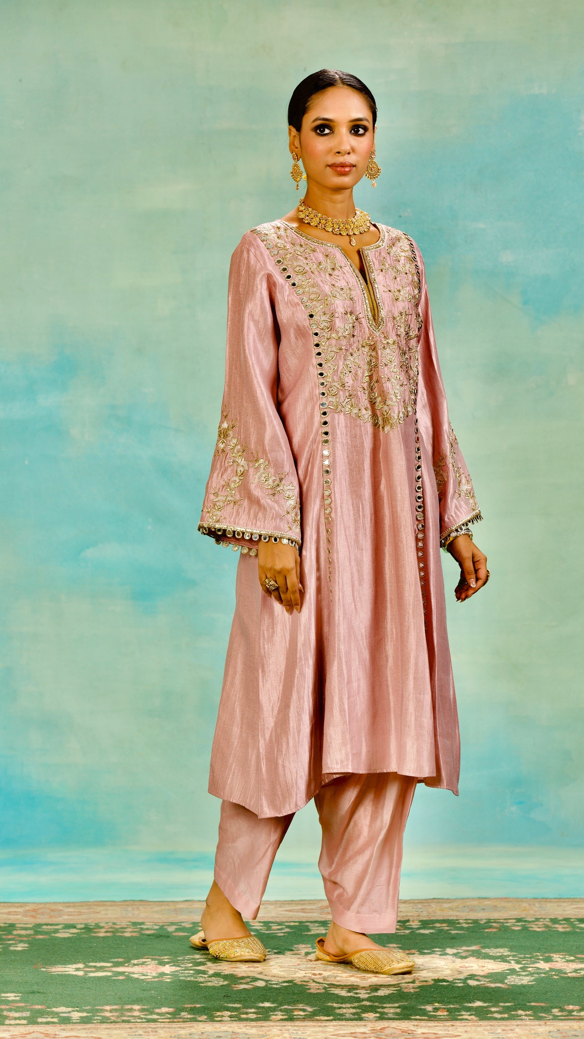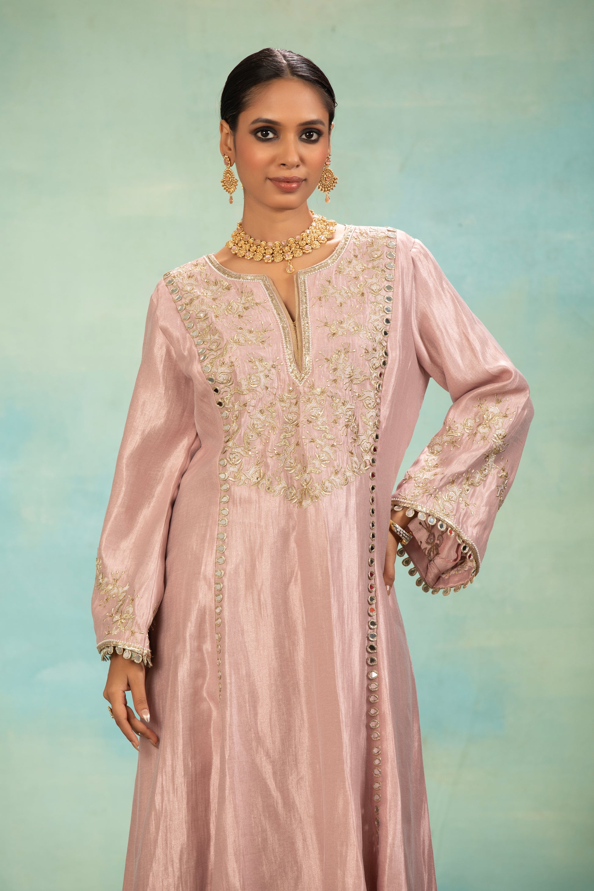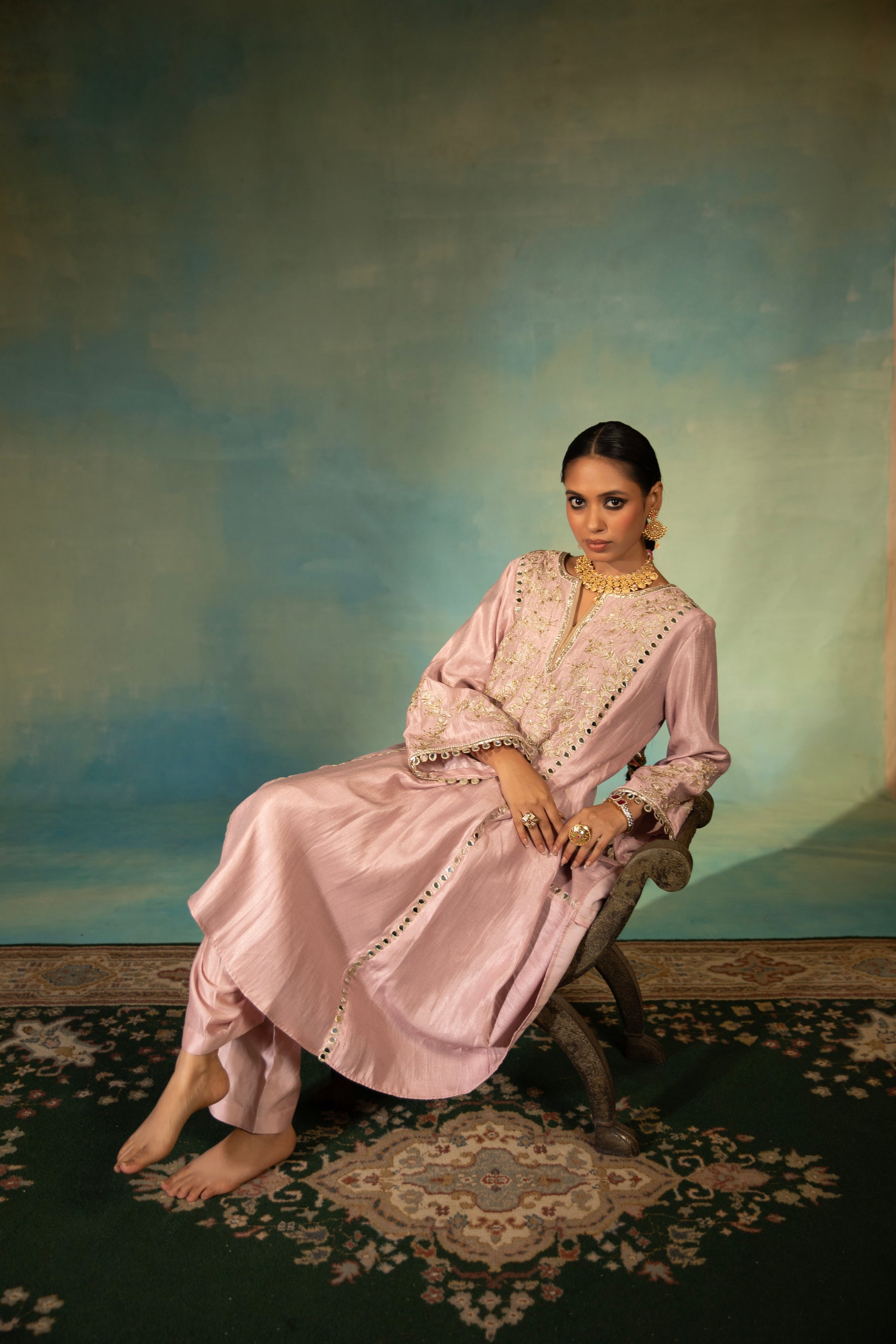 Embrace timeless elegance with the Gulbahar Choga Set, a masterpiece of refined craftsmanship. This exquisite ensemble features a soft pink tissue choga adorned with intricate dabka and zari embellishments gracing the neckline and sleeves. Paired with a coordinating tissue salwar and a luxuriously draped crush tissue dupatta, this set epitomizes grace and sophistication. Perfect for celebrations and special occasions, each piece showcases meticulous detailing that reflects traditional artistry with contemporary sensibility.