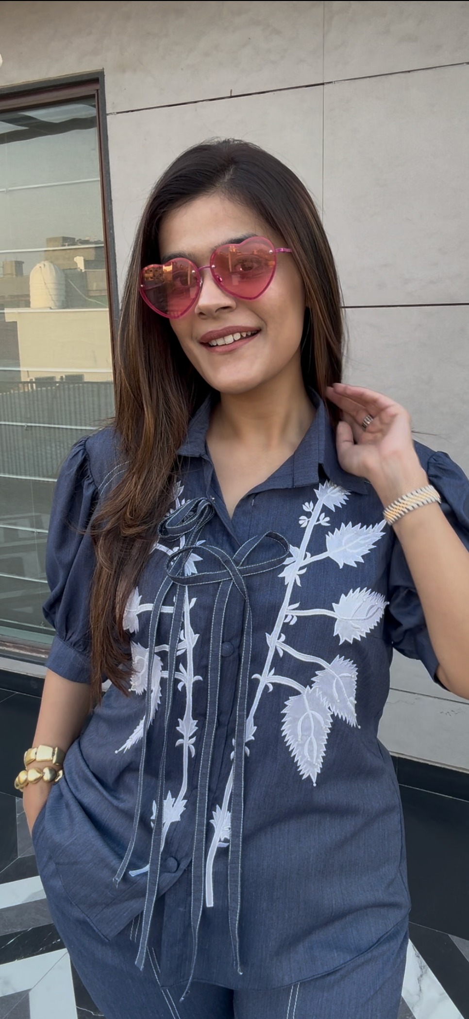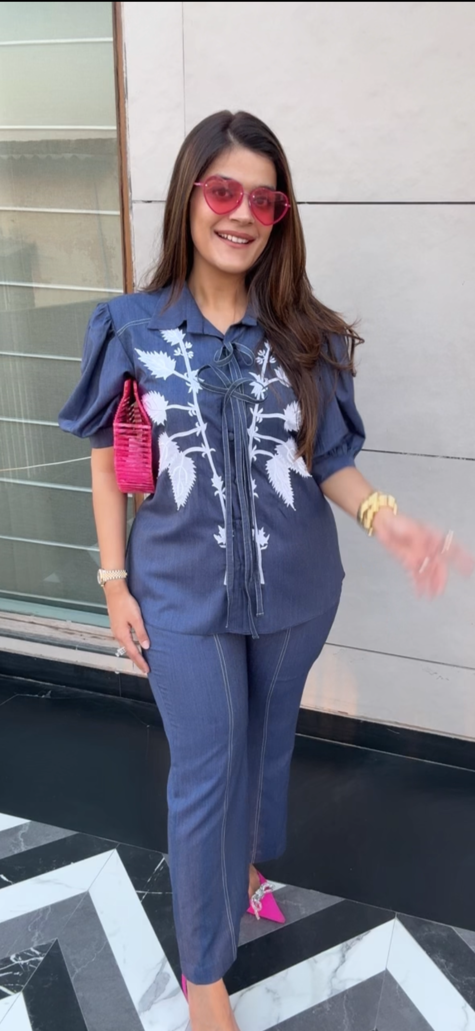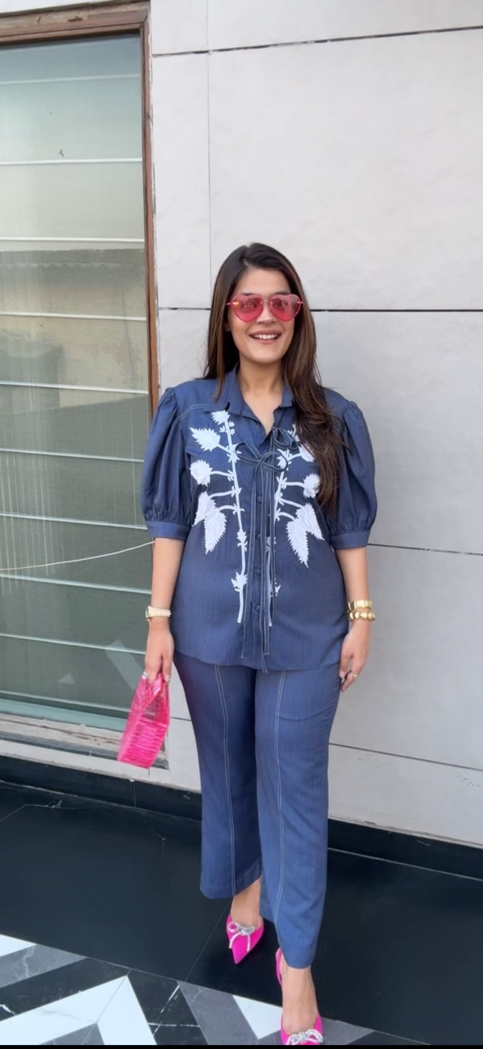 Indigo Grace is a refined cotton denim coordinate featuring expertly crafted contrast applique work. This ensemble combines the durability and comfort of cotton denim with intricate detailing, offering a sophisticated yet casual look. Ideal for those seeking a blend of traditional craftsmanship and contemporary style, it ensures both elegance and everyday wearability.