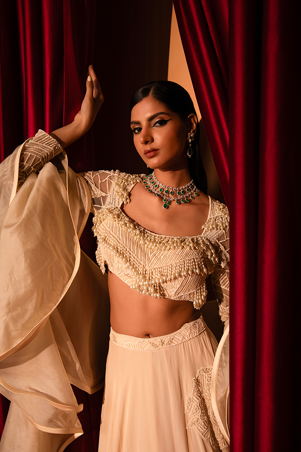 This elegant ivory ensemble exudes timeless sophistication with its intricate pearl and bead embellishments. The structured blouse, featuring delicate geometric embroidery and a layered pearl fringe, pairs seamlessly with the flowing skirt adorned with subtle floral detailing. Sheer, embellished sleeves and a graceful dupatta complete the regal look.