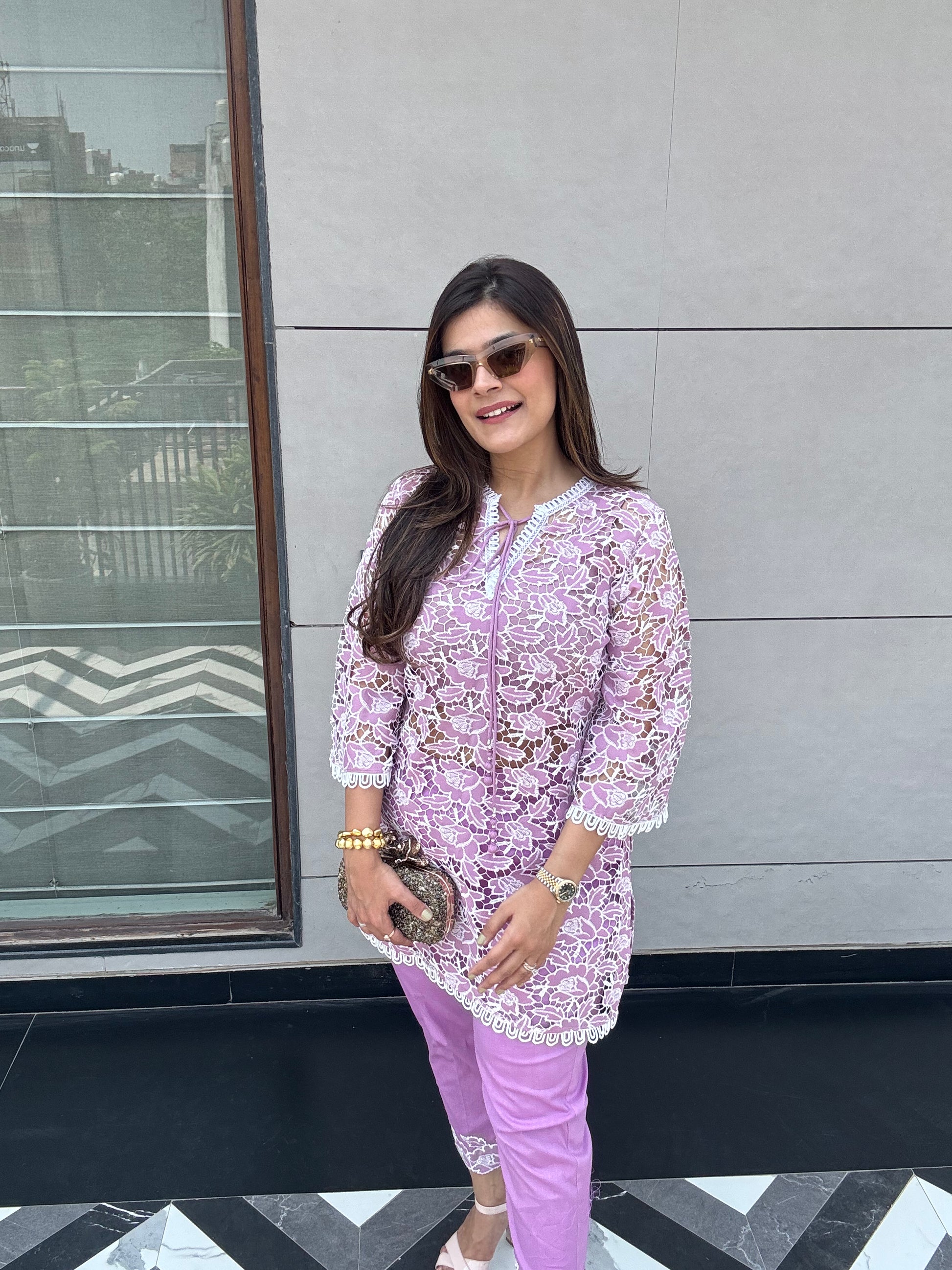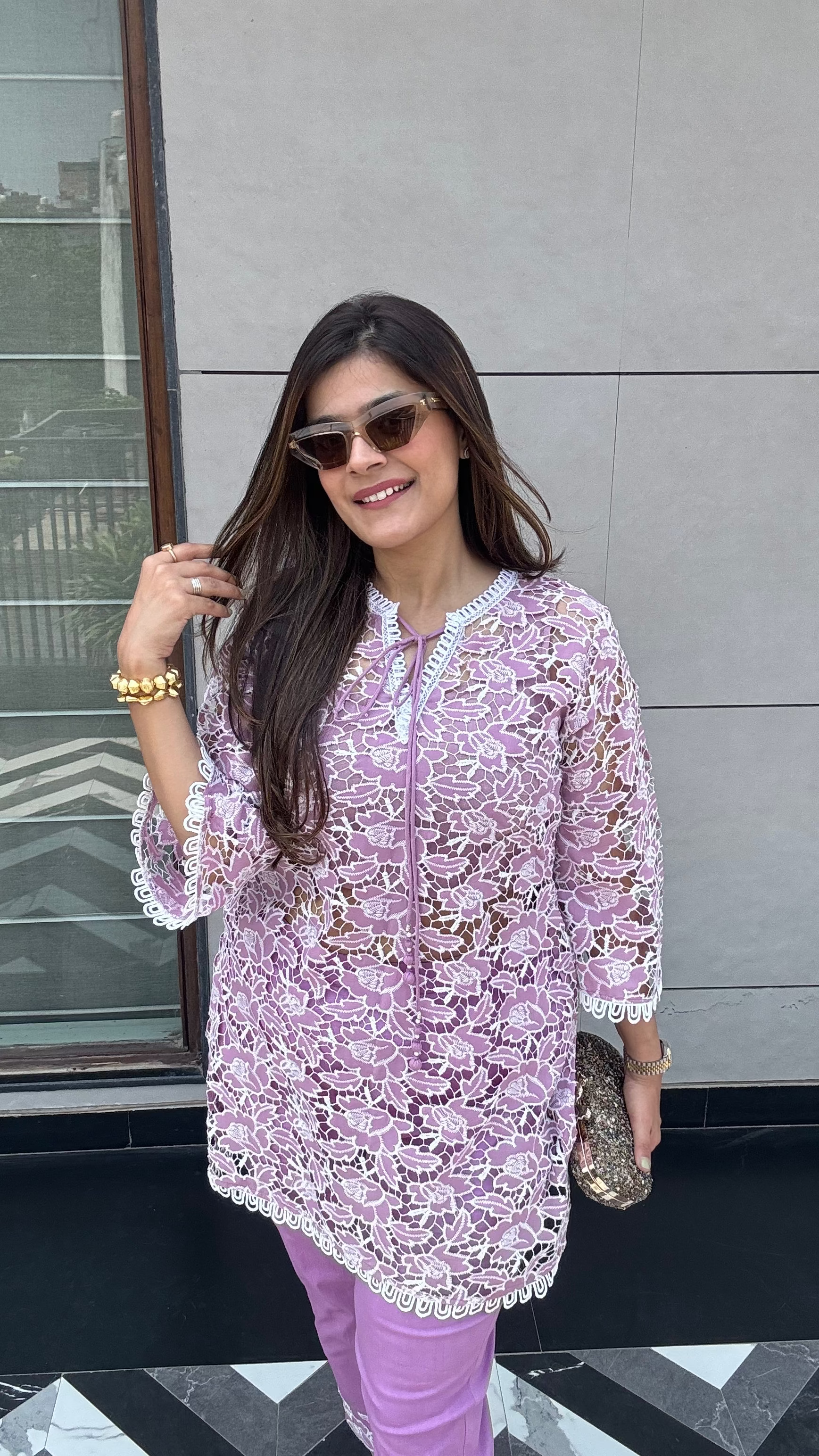 Lavender cutwork kurta paired with cotton pants featuring cutwork applique on the hemline.