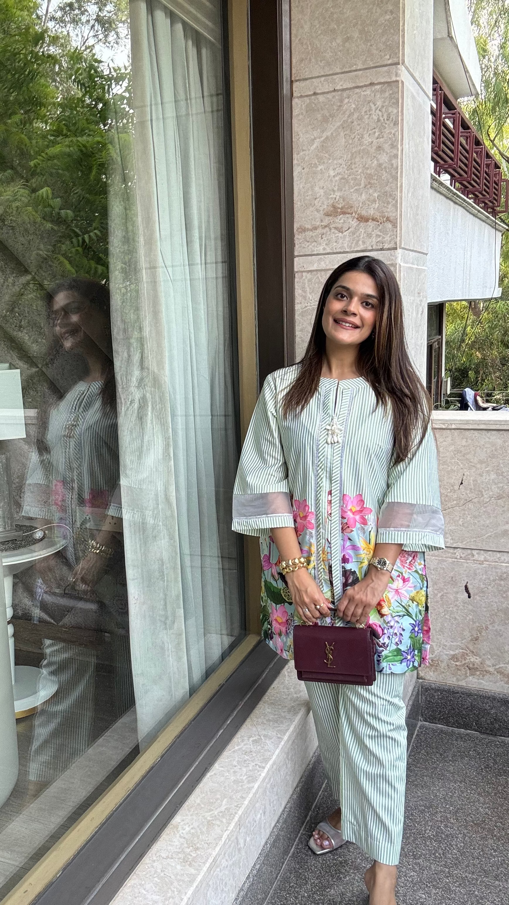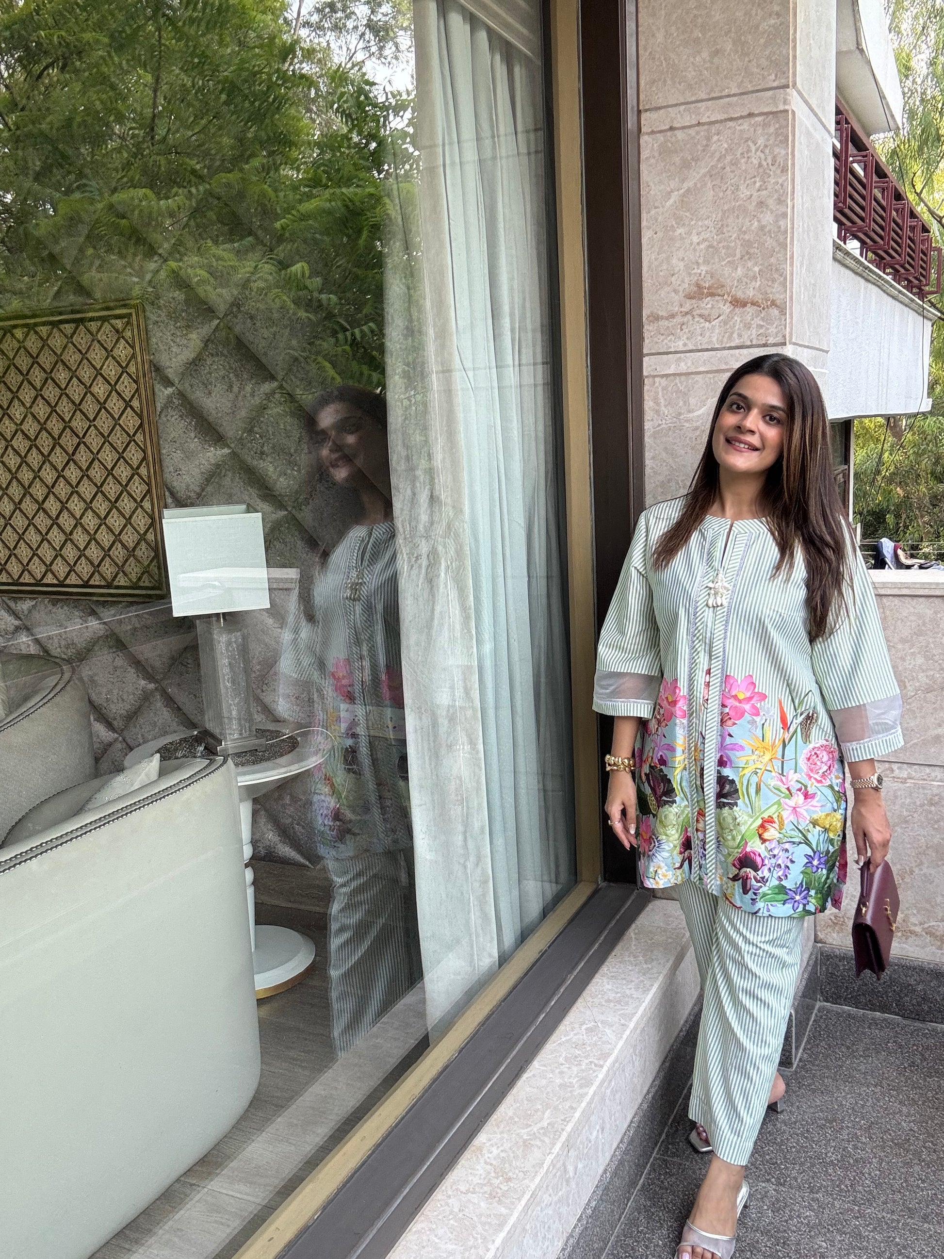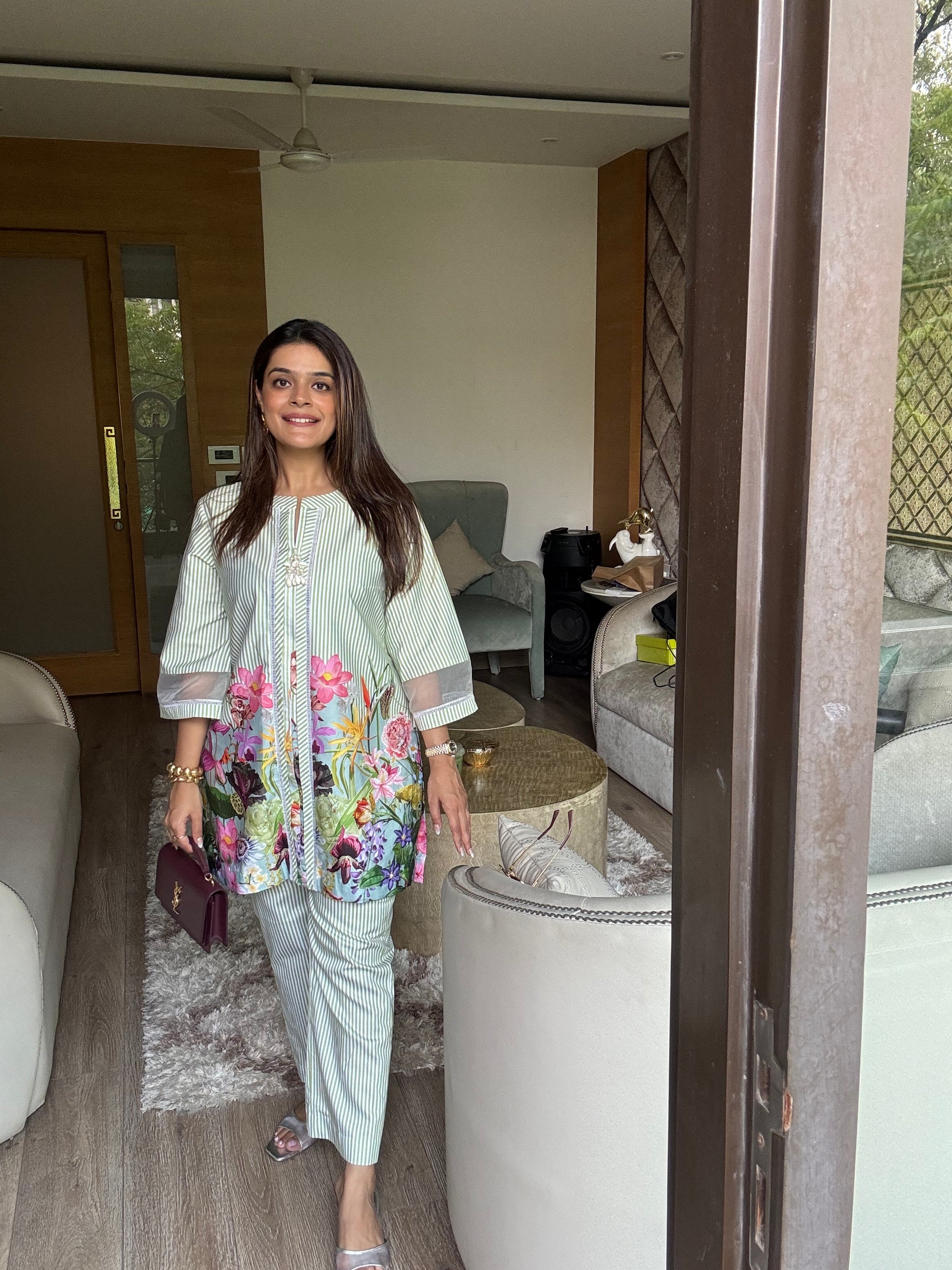 The Flora Cotton Co-ord elegantly combines timeless blue and white stripes with a refined floral print accentuating the bottom. Made from soft, breathable cotton, this set offers both comfort and a polished silhouette, perfect for those seeking understated sophistication in their wardrobe.