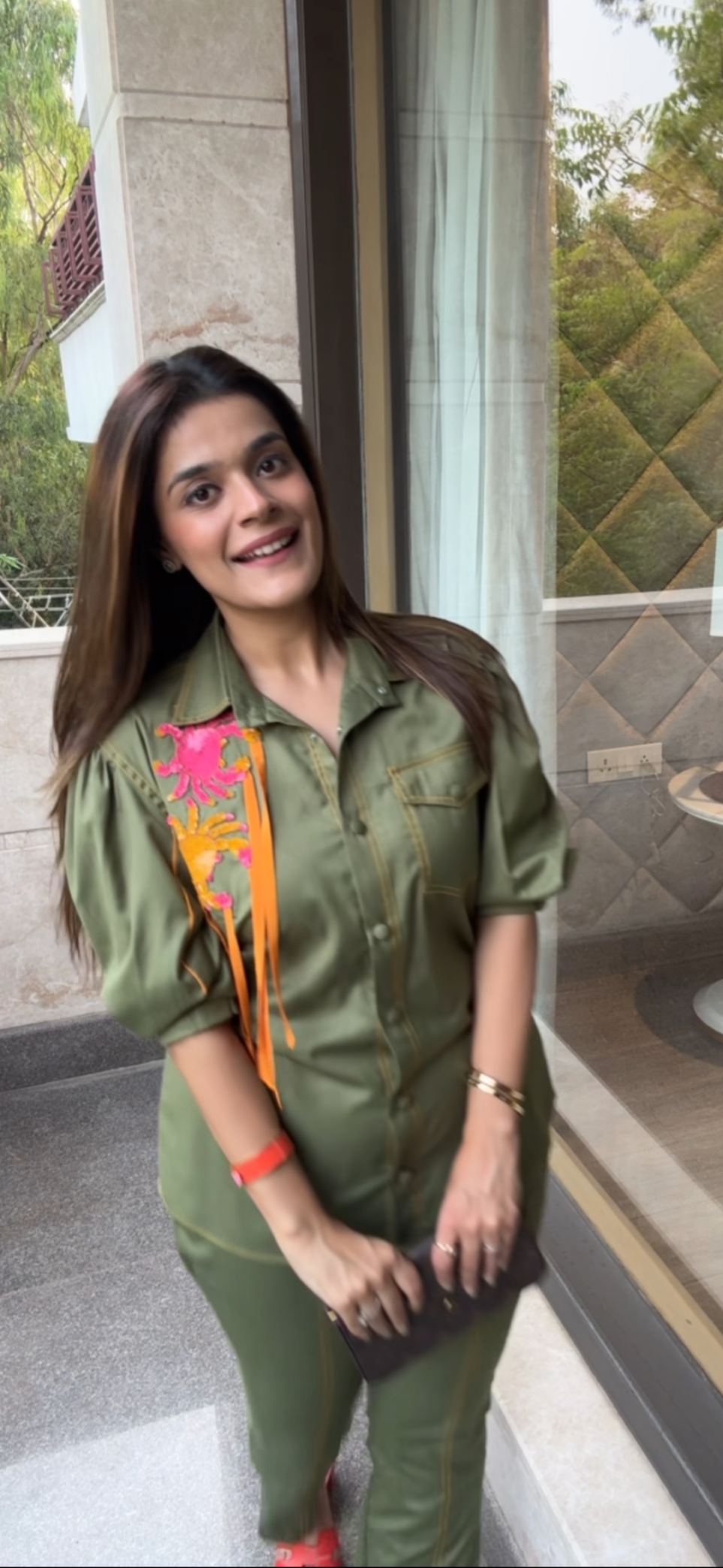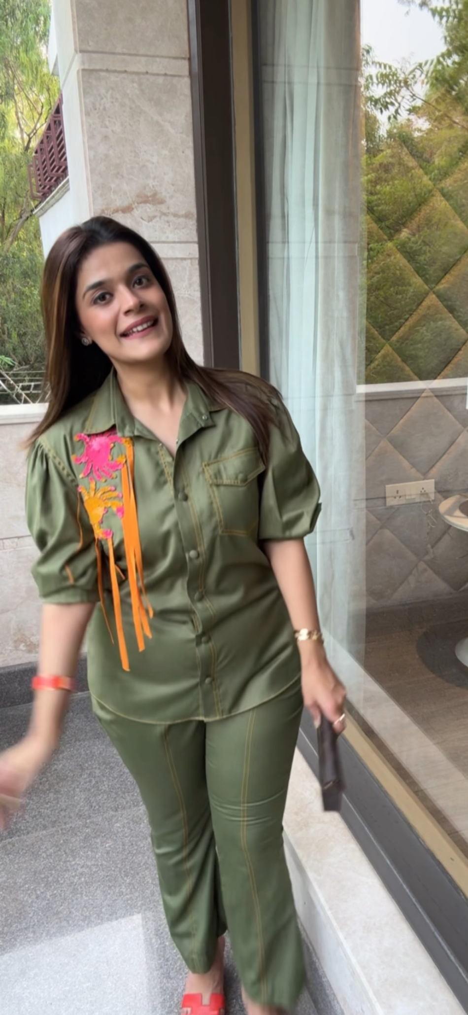 This elegant Crab Co-ord Set features olive fabric adorned with meticulously hand-embellished crab motifs, showcasing expert craftsmanship. The subtle color palette combined with detailed embroidery offers a refined and unique look, perfect for those seeking sophisticated yet distinctive attire. Ideal for stylish occasions, this set balances comfort with artisanal design.