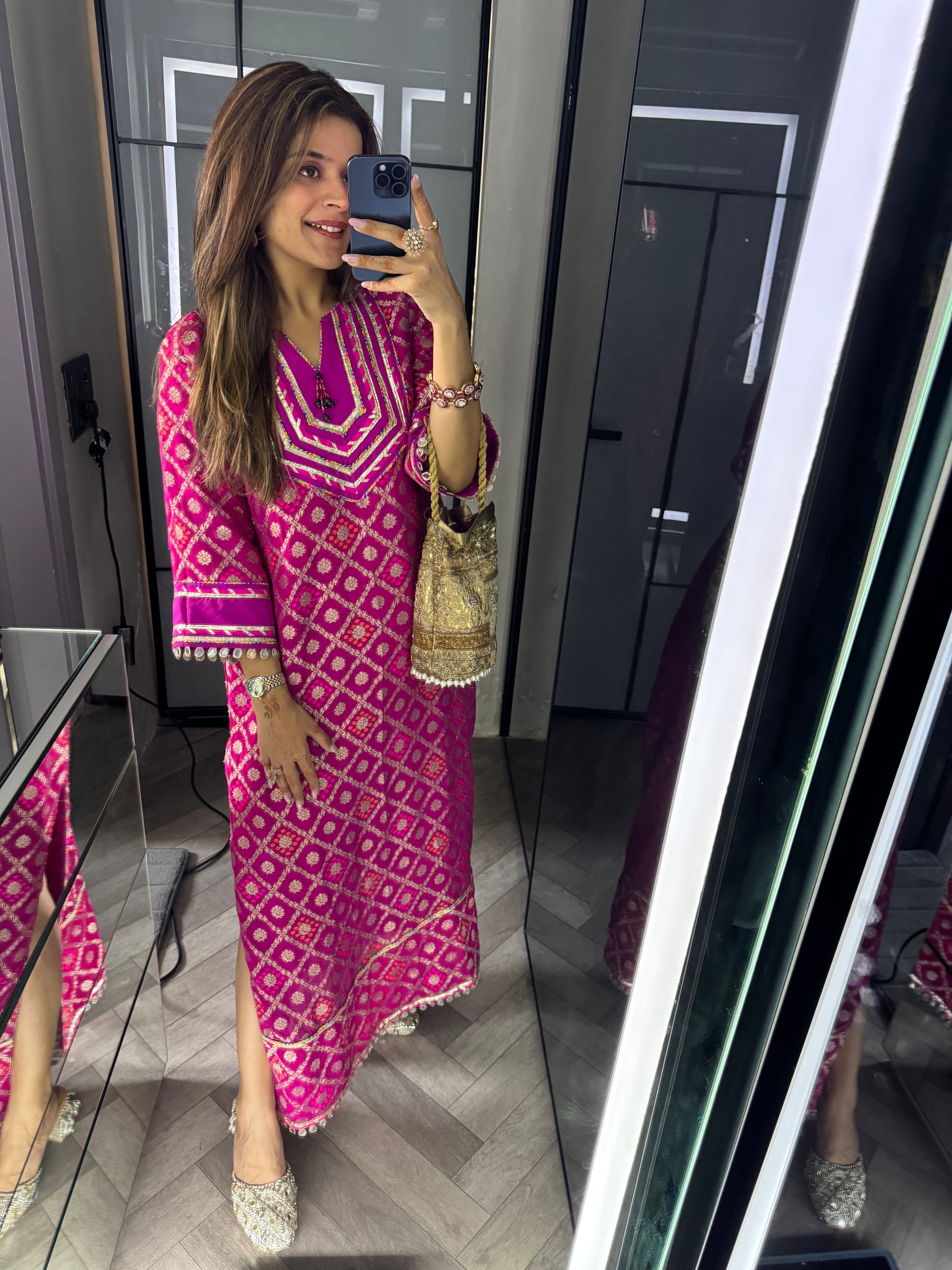 Elevate your ethnic wardrobe with this stunning Rani Brocade Kaftan, a masterpiece of traditional craftsmanship. Crafted from luxurious brocade fabric in a rich rani hue, this kaftan features intricate gota embellishments that add timeless elegance and cultural authenticity. The flowing silhouette offers comfort without compromising on style, making it perfect for festive occasions, celebrations, or refined everyday wear. The detailed gota work showcases meticulous artistry, transforming this piece into a statement garment that honors heritage while exuding contemporary sophistication.