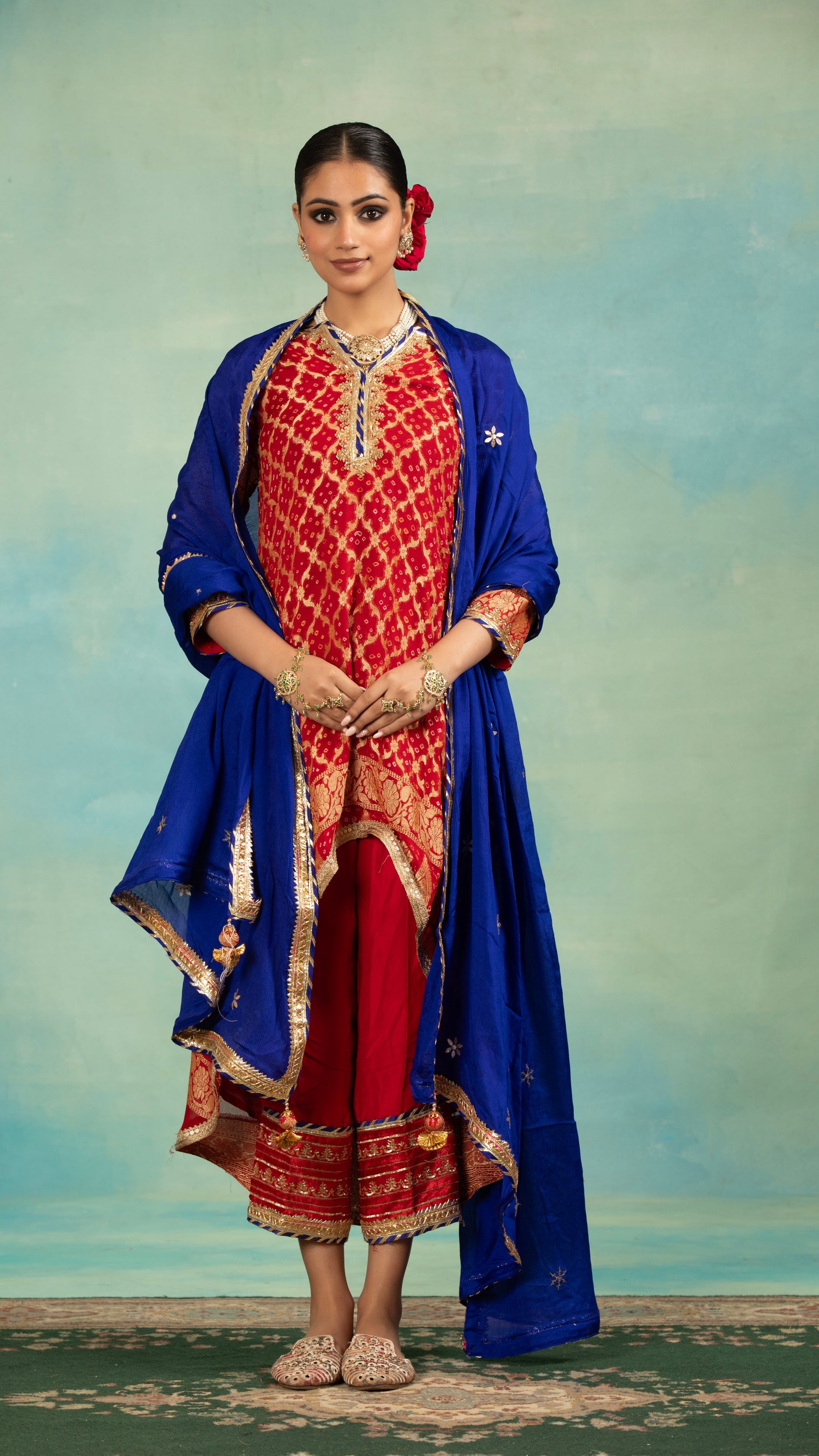 Elevate your ethnic wardrobe with this striking red brocade kurta set, where traditional craftsmanship meets contemporary silhouette. The luxurious brocade fabric is adorned with intricate sequin work and detailed embroidery, while the mandarin collar adds a refined, modern edge. The high-low hemline creates an elegant drape that flatters every frame, offering both grace and movement. Paired with a coordinating dupatta, this ensemble is perfect for festive celebrations, weddings, or special occasions where you wish to make a sophisticated statement.