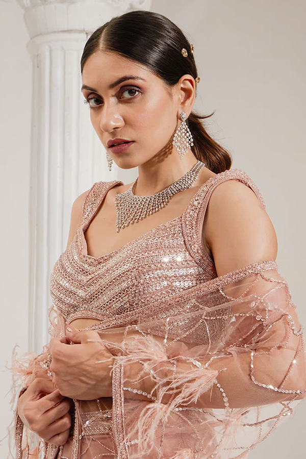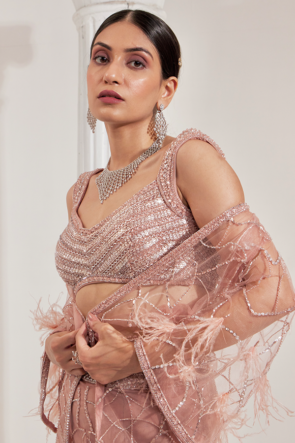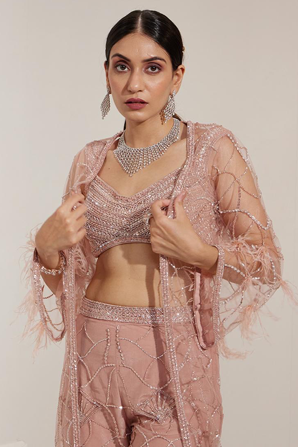 A statement of modern glamour, this blush-toned co-ord set exudes confidence and allure. The intricately embroidered bralette pairs effortlessly with sheer, wide-leg pants, creating a sleek and edgy silhouette. Topped with a matching long jacket adorned with delicate beadwork and feathered cuffs, this ensemble strikes the perfect balance between elegance and boldness. Whether you're attending a cocktail evening or a high-fashion event, this outfit guarantees all eyes on you. Pair it with sparkling jewels and nude heels for a head-turning look!