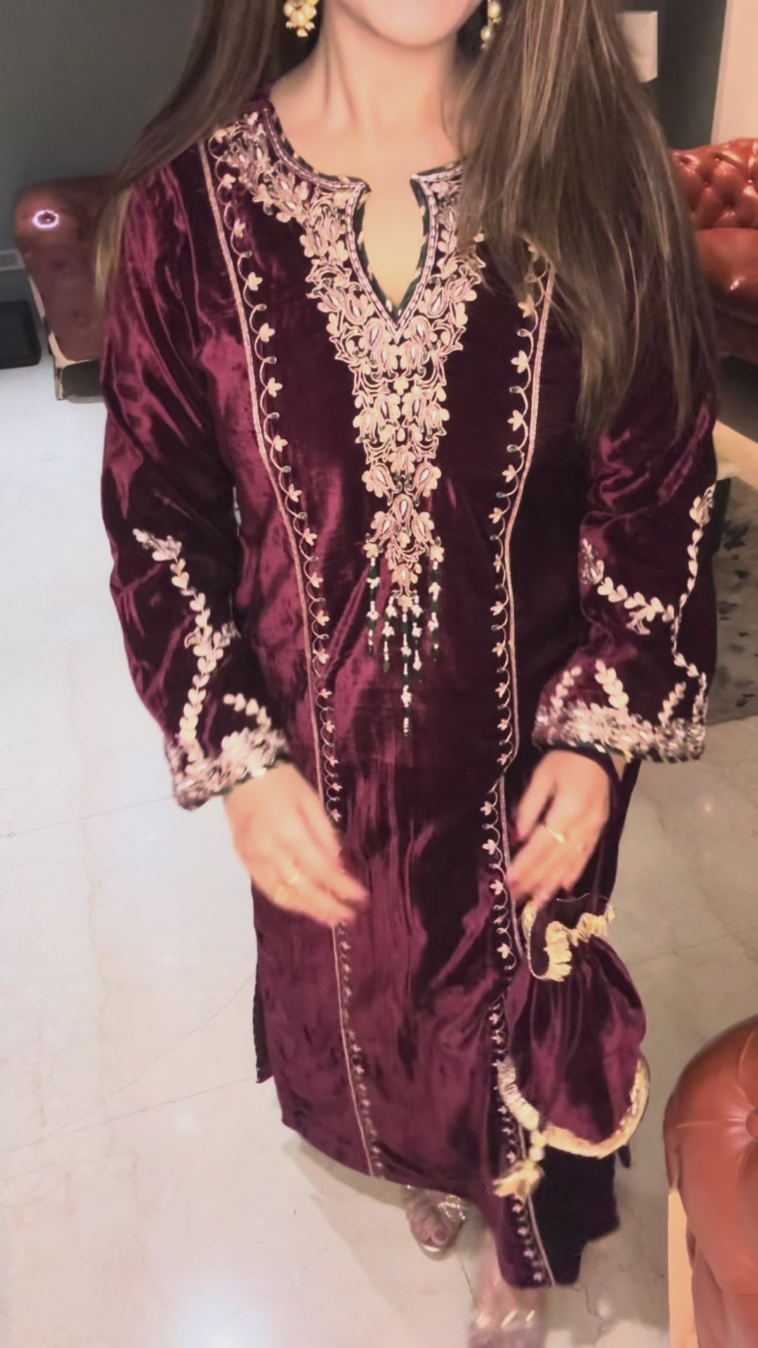 Draped in sumptuous ruby velvet, this kaftan embodies timeless elegance with a contemporary silhouette. The luxurious fabric falls gracefully, creating an effortless flow that flatters every form. Perfect for intimate gatherings or leisurely evenings, this piece transitions seamlessly from day to night. The rich crimson hue exudes confidence and refinement, while the relaxed fit ensures comfort without compromising on style. A wardrobe essential for those who appreciate the marriage of opulence and understated sophistication.