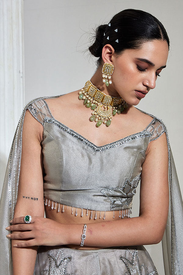 Drape yourself in elegance with this ethereal silver lehenga set, designed for the modern muse. The structured blouse features delicate bead detailing and floral embellishments, beautifully complemented by a voluminous lehenga adorned with intricate silver embroidery. A flowing cape dupatta adds a touch of grandeur, making it a perfect choice for receptions, cocktail soirées, or festive celebrations. Style it with statement jewellery for an effortlessly regal look.