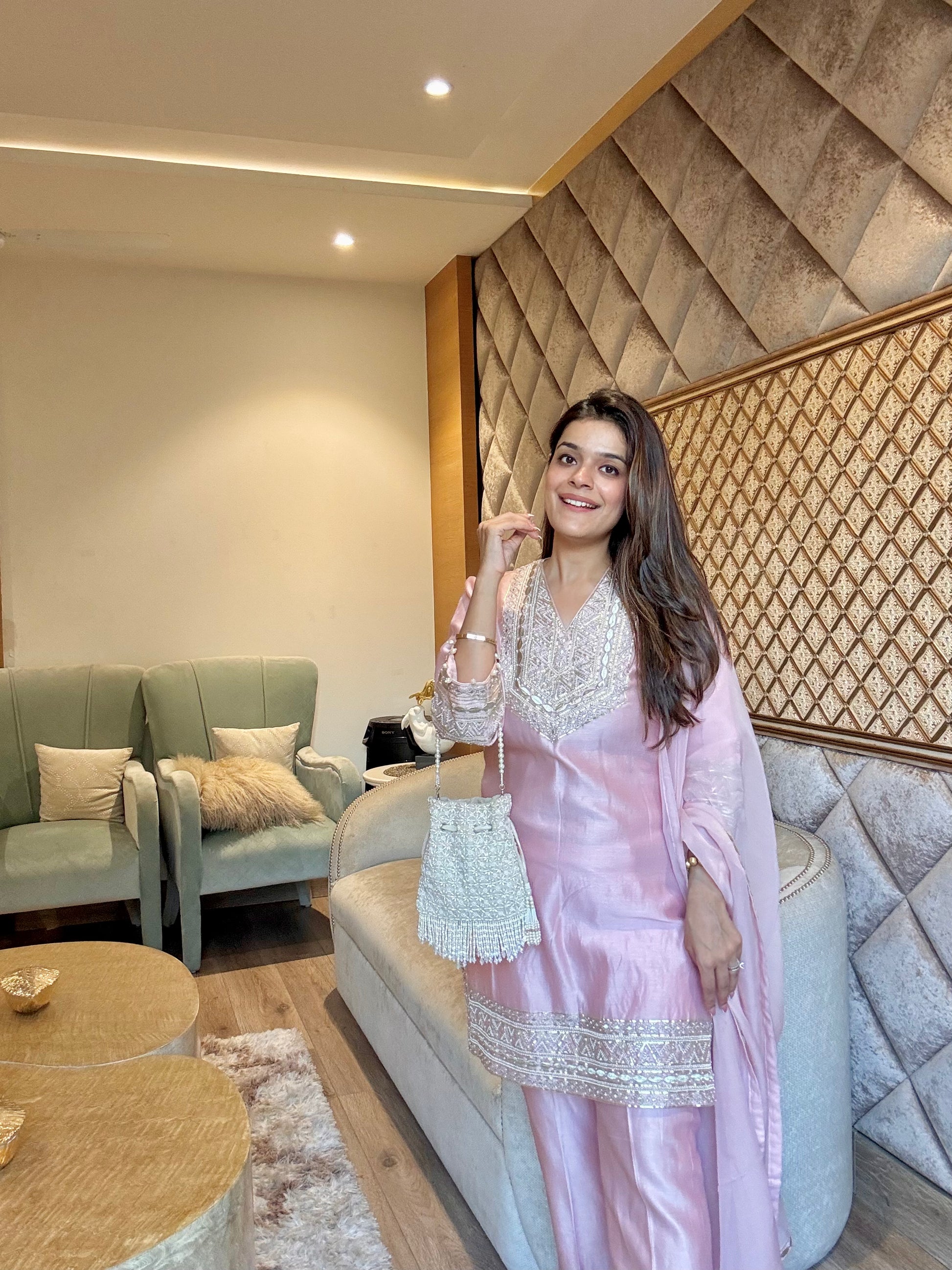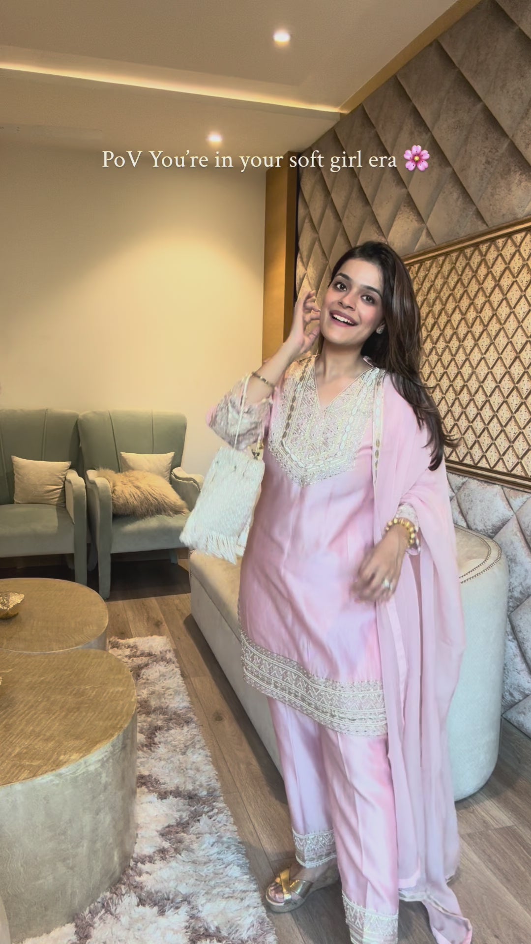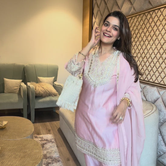 Experience elegance in this Sunheri Pink Kurta Set crafted from luxurious chanderi fabric. The soft petal pink hue complements delicate zari and pearl embellishments, creating a refined and graceful look. Perfect for festive occasions, this kurta set blends traditional artistry with contemporary style, ensuring you stand out with subtle sophistication.