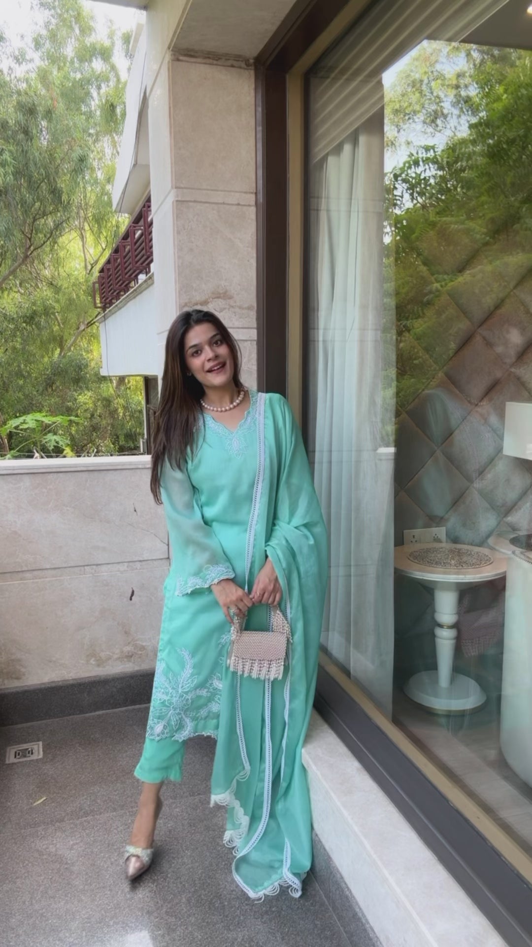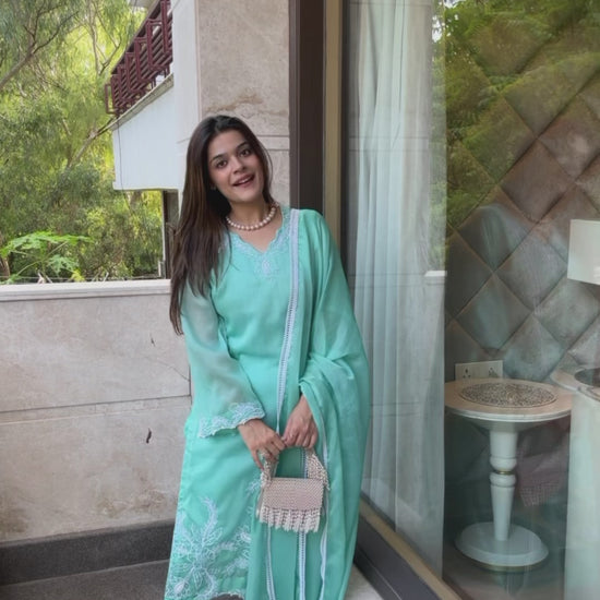 This elegant turquoise organza kurta set is adorned with intricate resham embroidery and delicate pearl embellishments, offering a refined and graceful look.