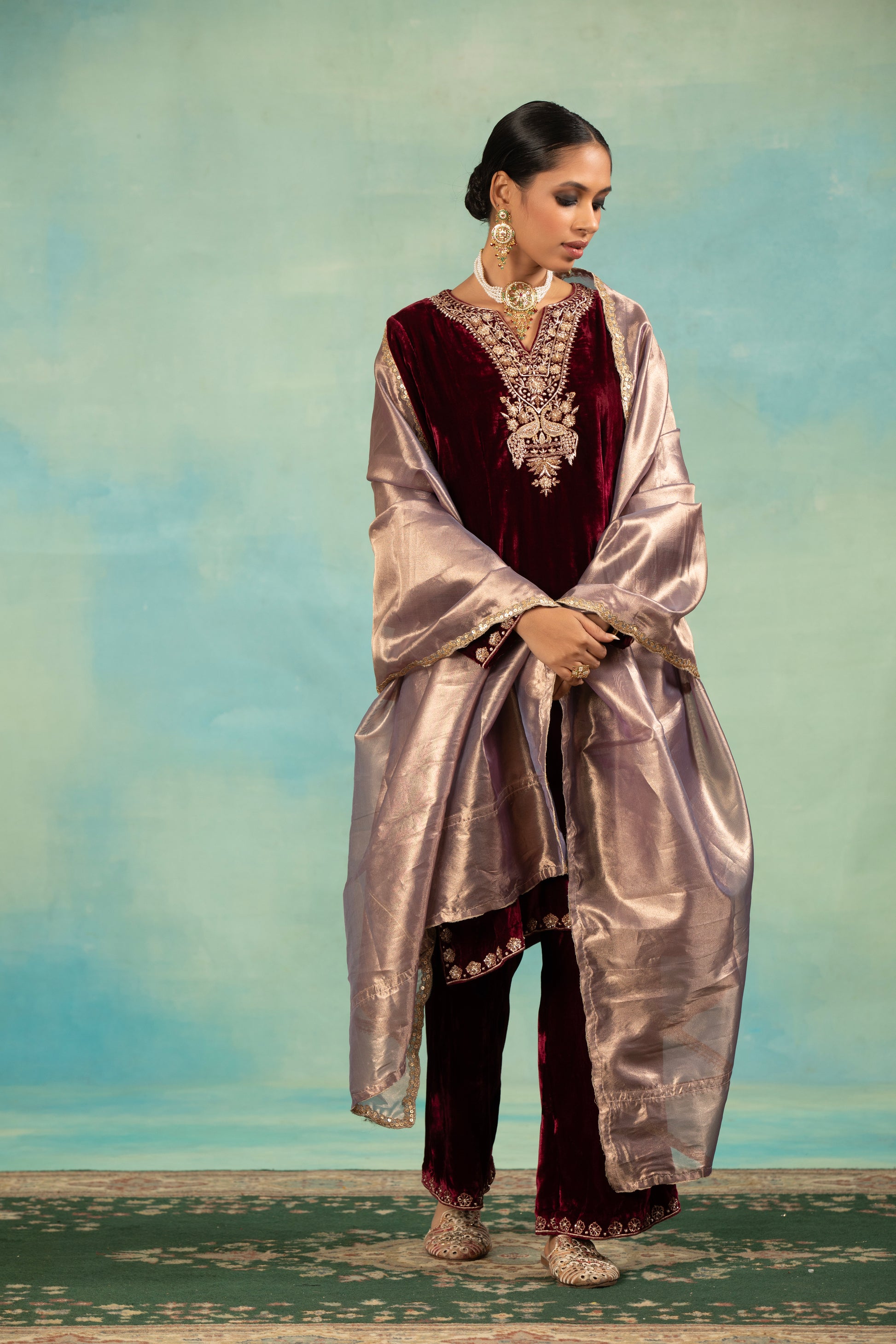 Indulge in timeless elegance with this exquisite velvet kurta set, adorned with intricate dabka embroidery that captures the essence of traditional craftsmanship. The luxurious velvet fabric drapes gracefully, offering both comfort and a refined silhouette perfect for festive occasions and celebrations. Each piece is meticulously embellished with hand-worked dabka details, creating a stunning interplay of texture and light. This sophisticated ensemble combines heritage artistry with contemporary styling, making it an ideal choice for those who appreciate couture quality and cultural richness in their wardrobe.