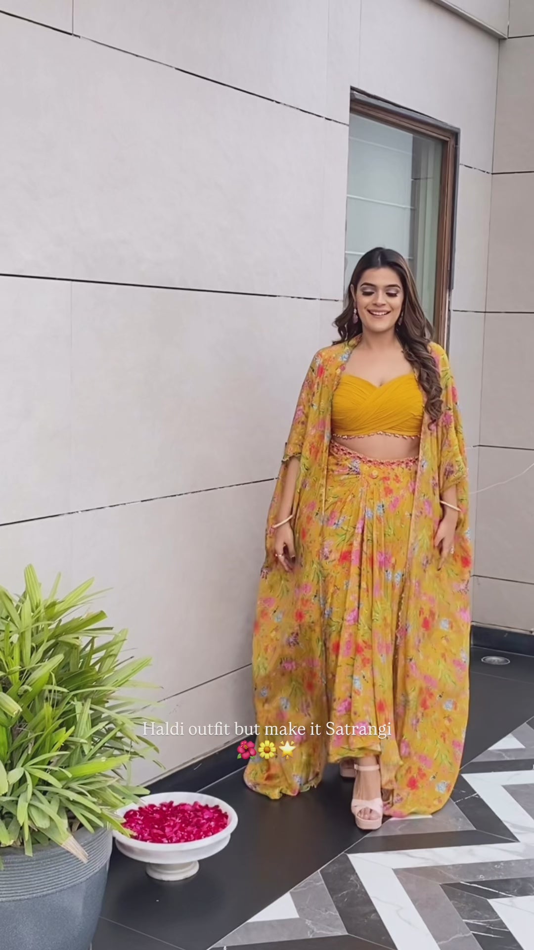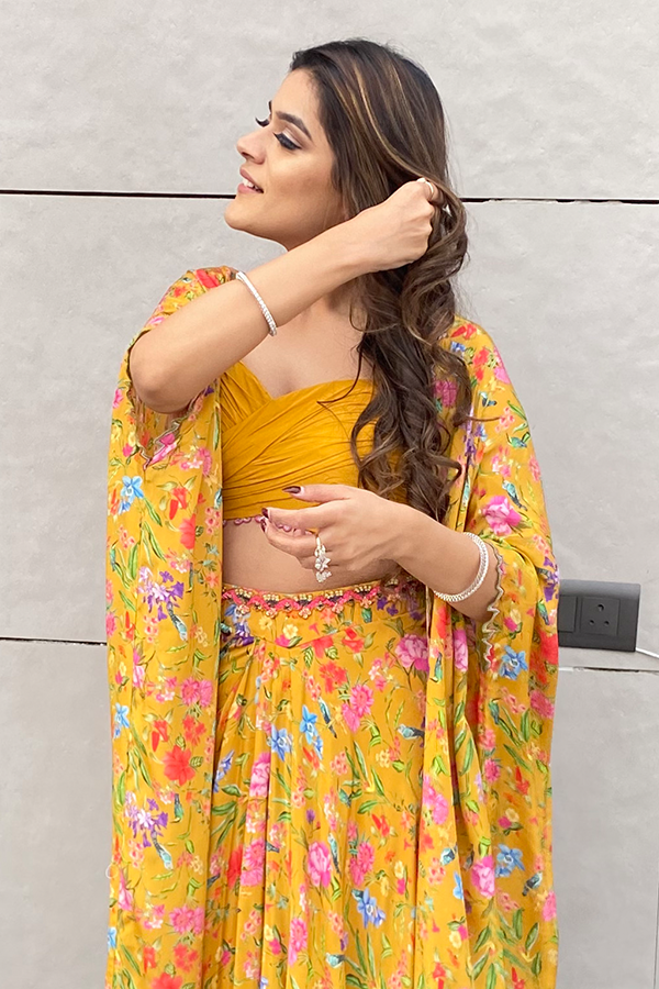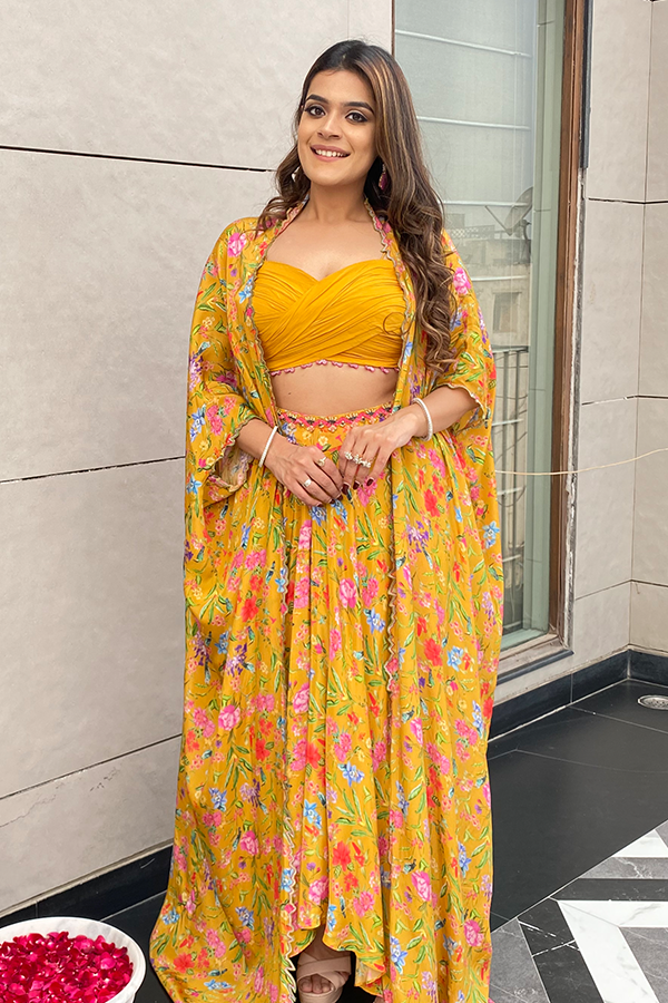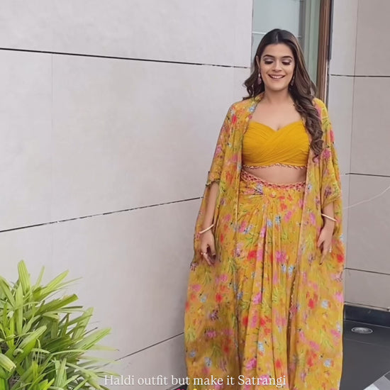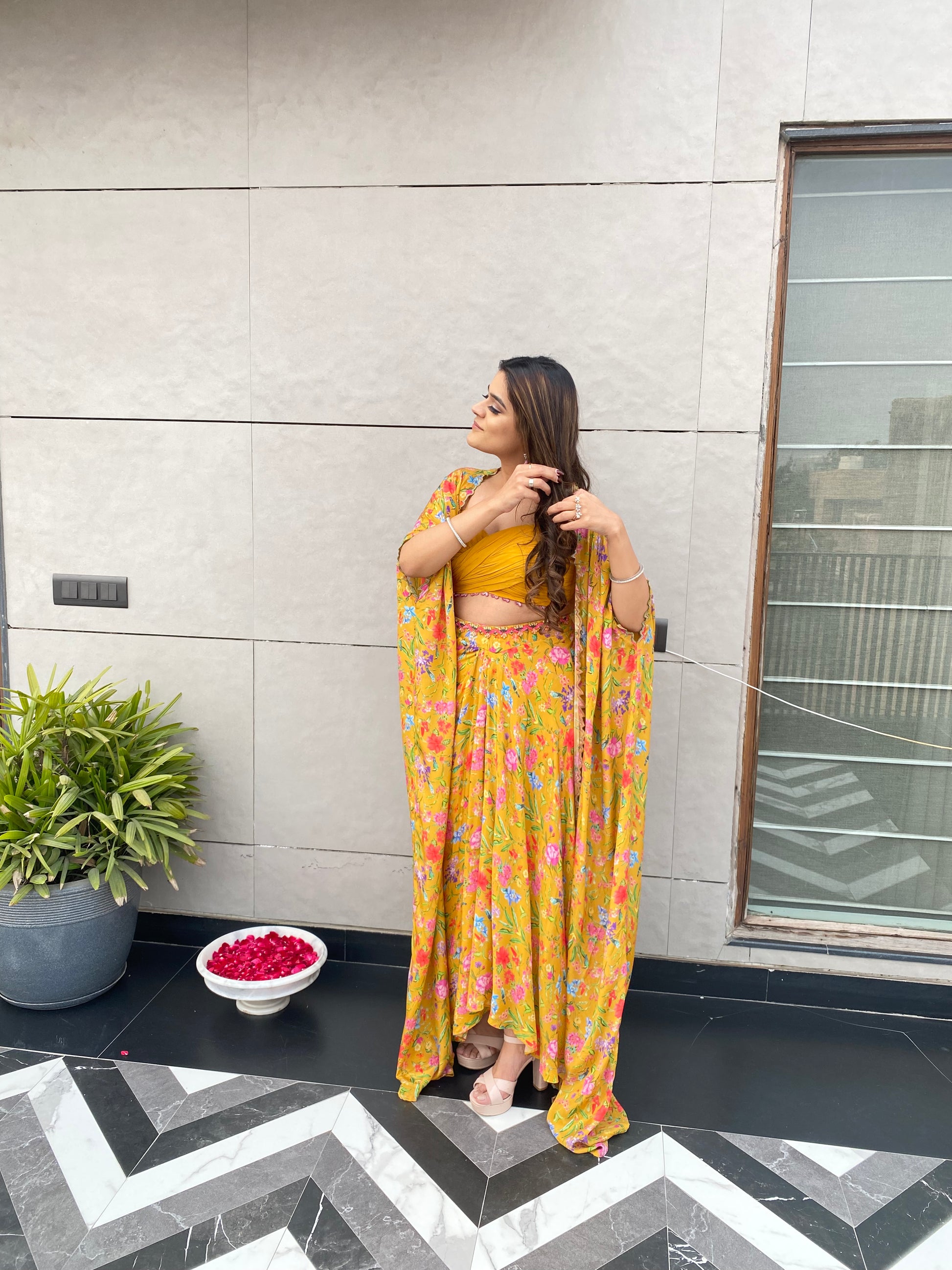 Radiate warmth and elegance in our Golden Bloom Cape Set, a mesmerizing fusion of rich hues and fluid draping. This ensemble features a beautifully ruched bustier in a luxurious mustard tone, paired with a flowy pleated skirt adorned in vibrant floral prints. Completing the look is a statement cape that adds movement and grace, making this outfit perfect for mehendi celebrations, destination weddings, or festive soirées. Designed for the modern muse who loves effortless glamour, this look is a celebration of color, confidence, and contemporary charm.